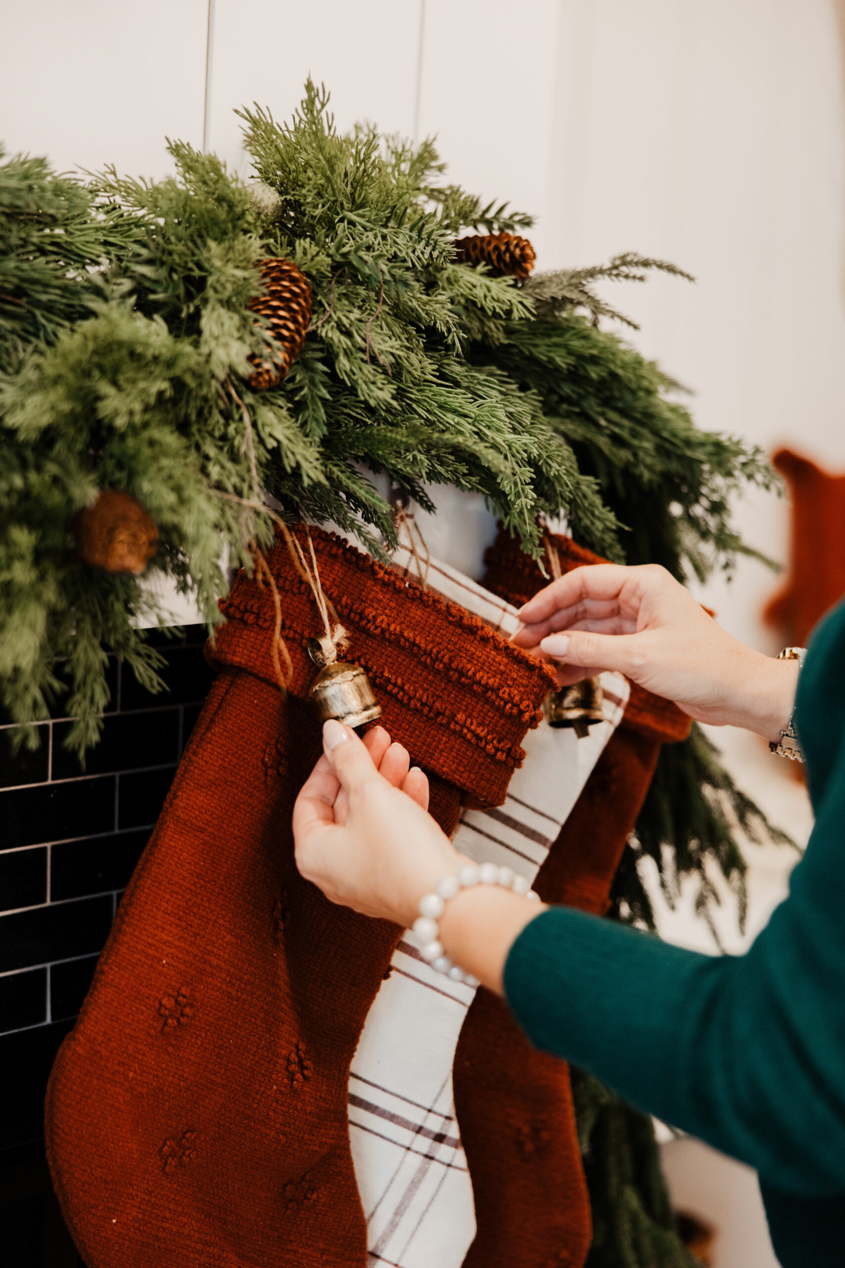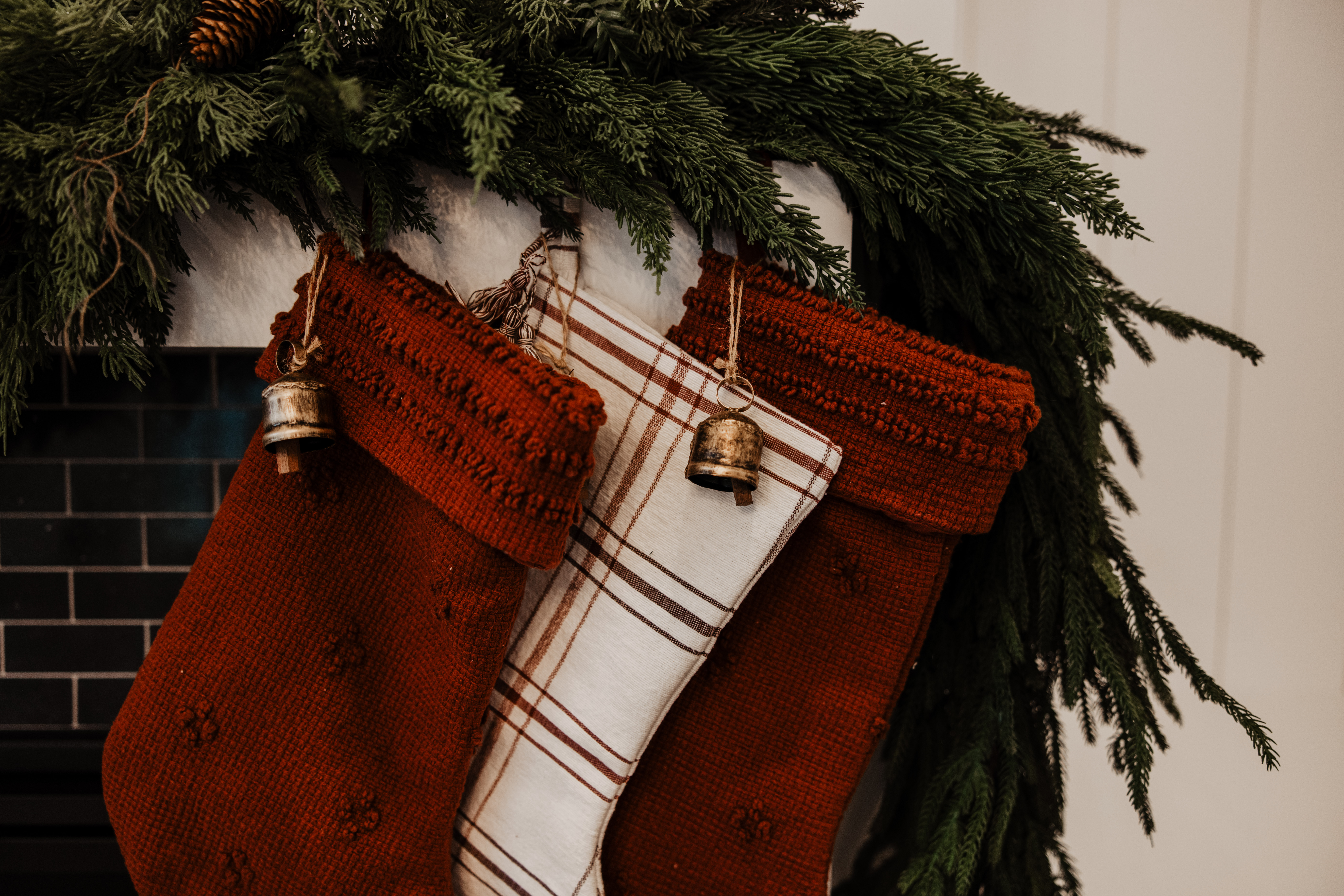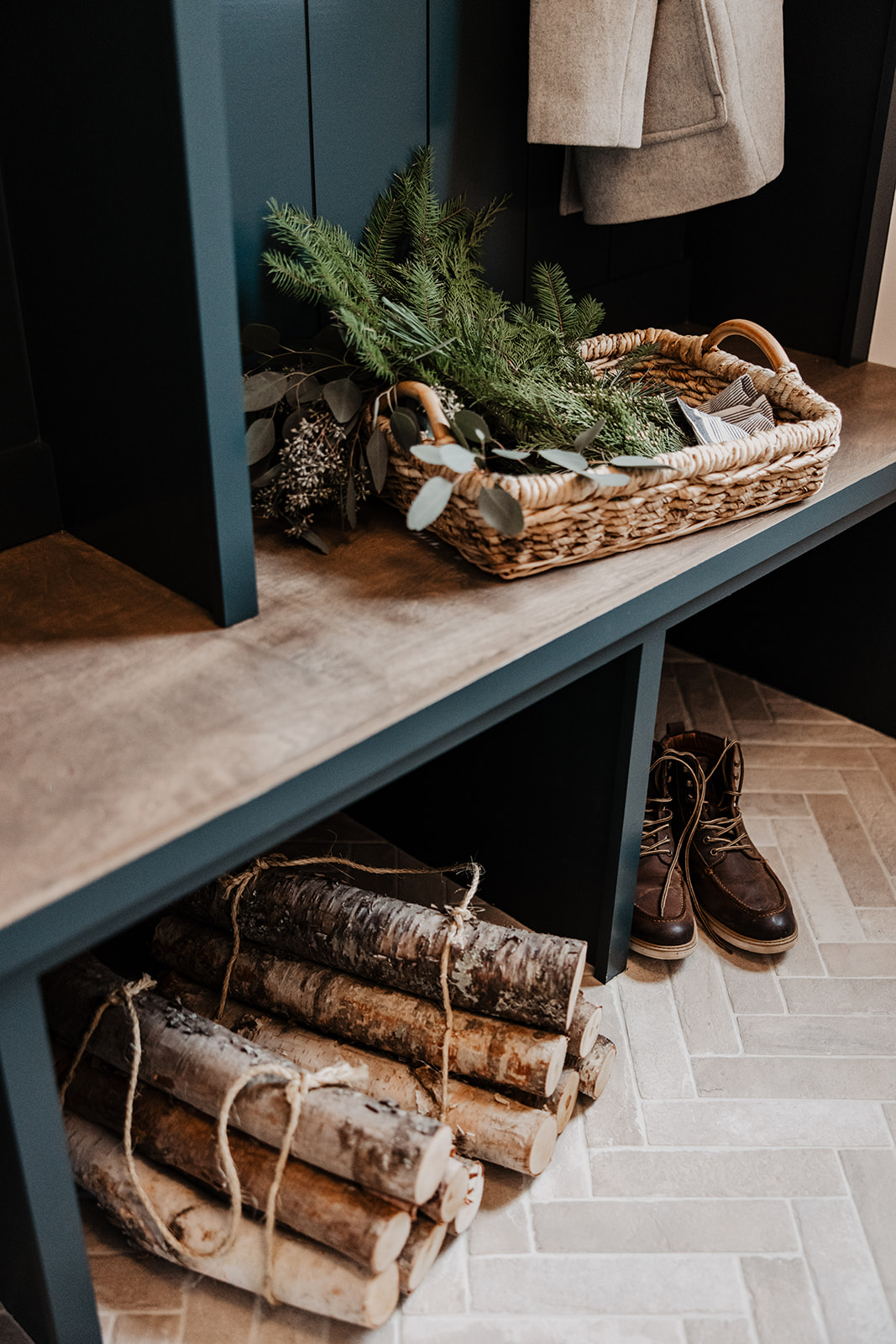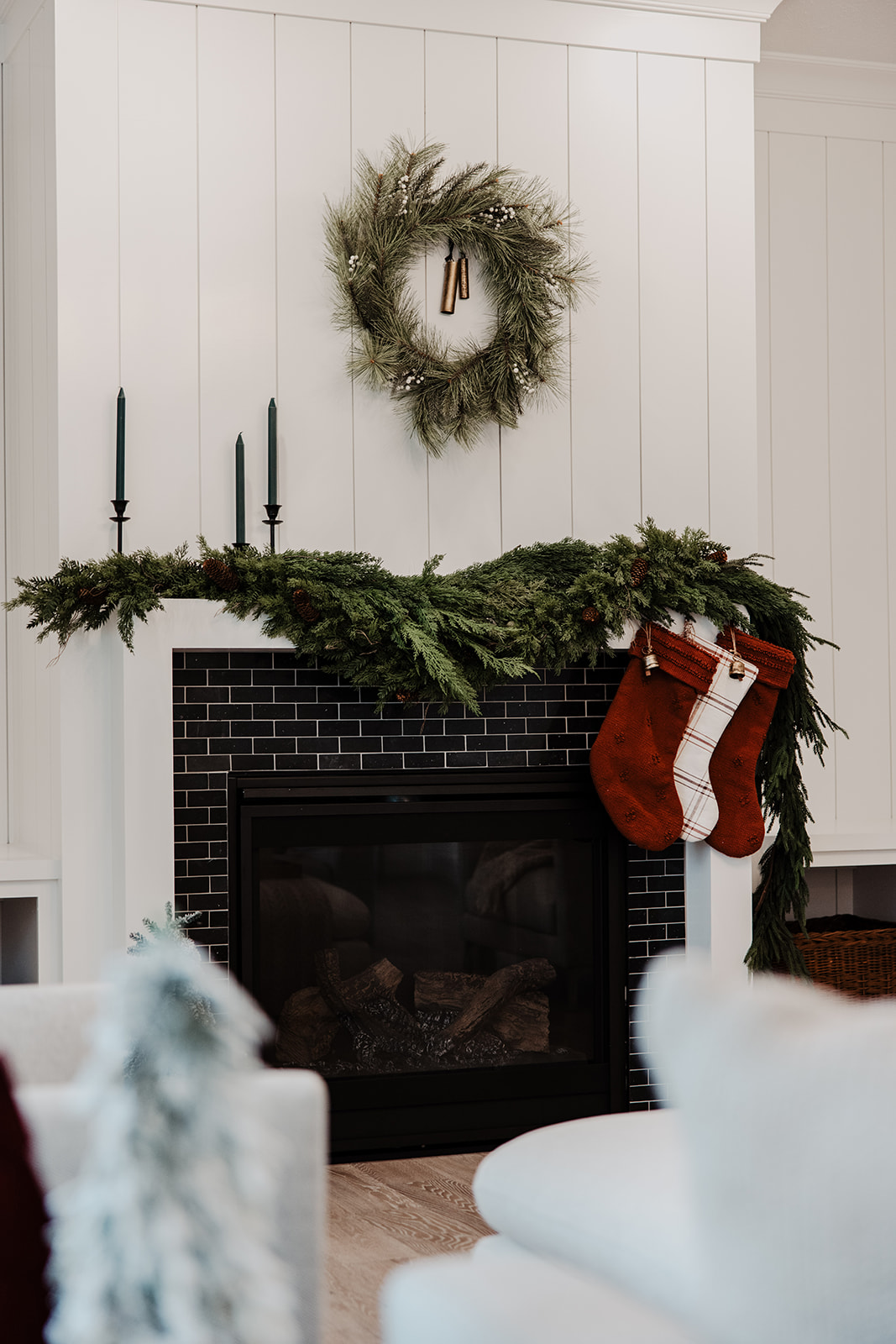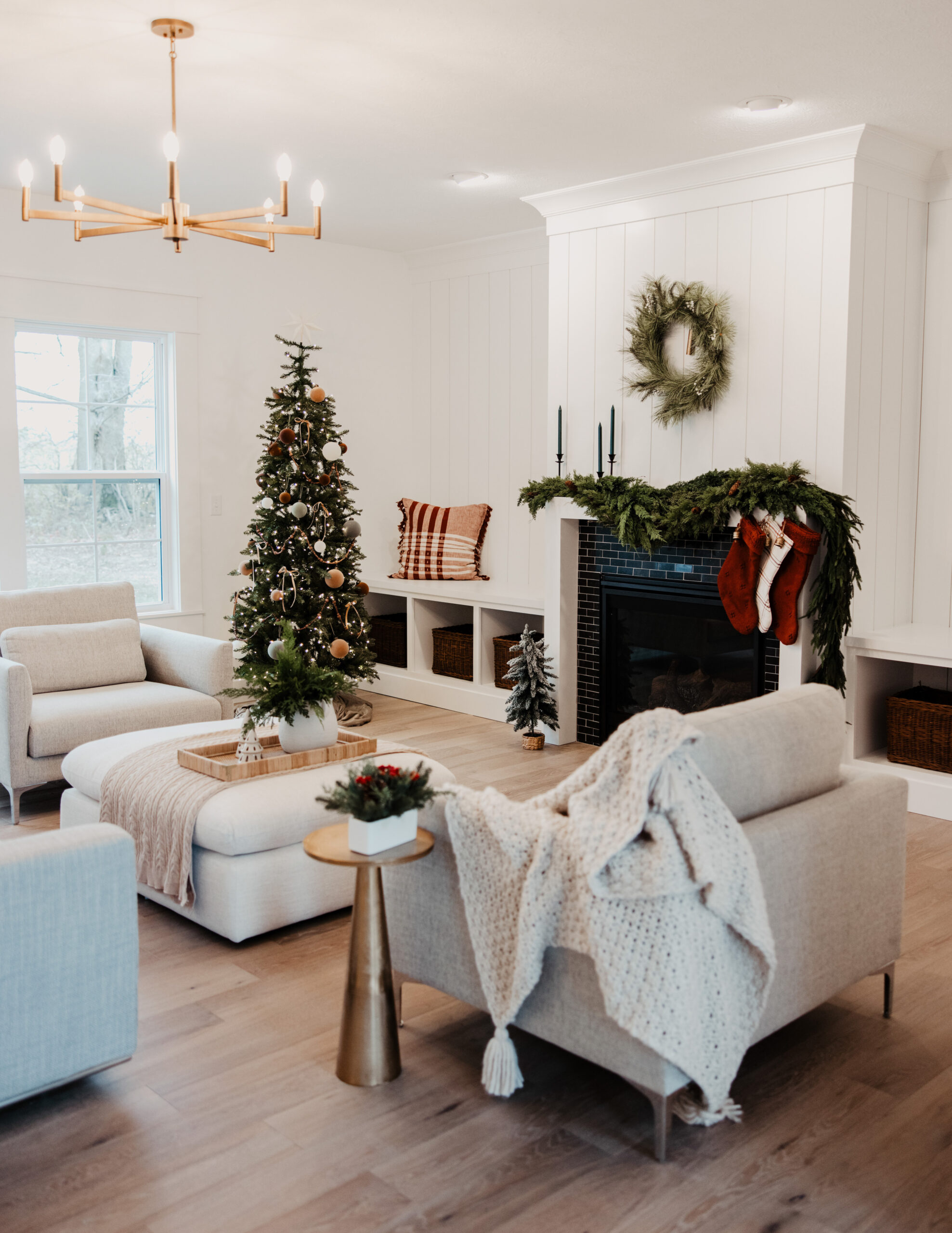 We chose to go with vertical shiplap walls to bring warmth and character into this space. The custom bench seating provides extra storage as well as cozy seating for guests to enjoy. These built-in benches also provide the home with a range of styling possibilities. Adding textured throw pillows and blankets depending on seasonal decor variations is a must! With it only being a week away from Christmas, we chose oversized woven pillows with traditional red, cream, and plaid colors/ patterns. Textural variation is the best way to way to switch up and embrace seasonal decor changes.