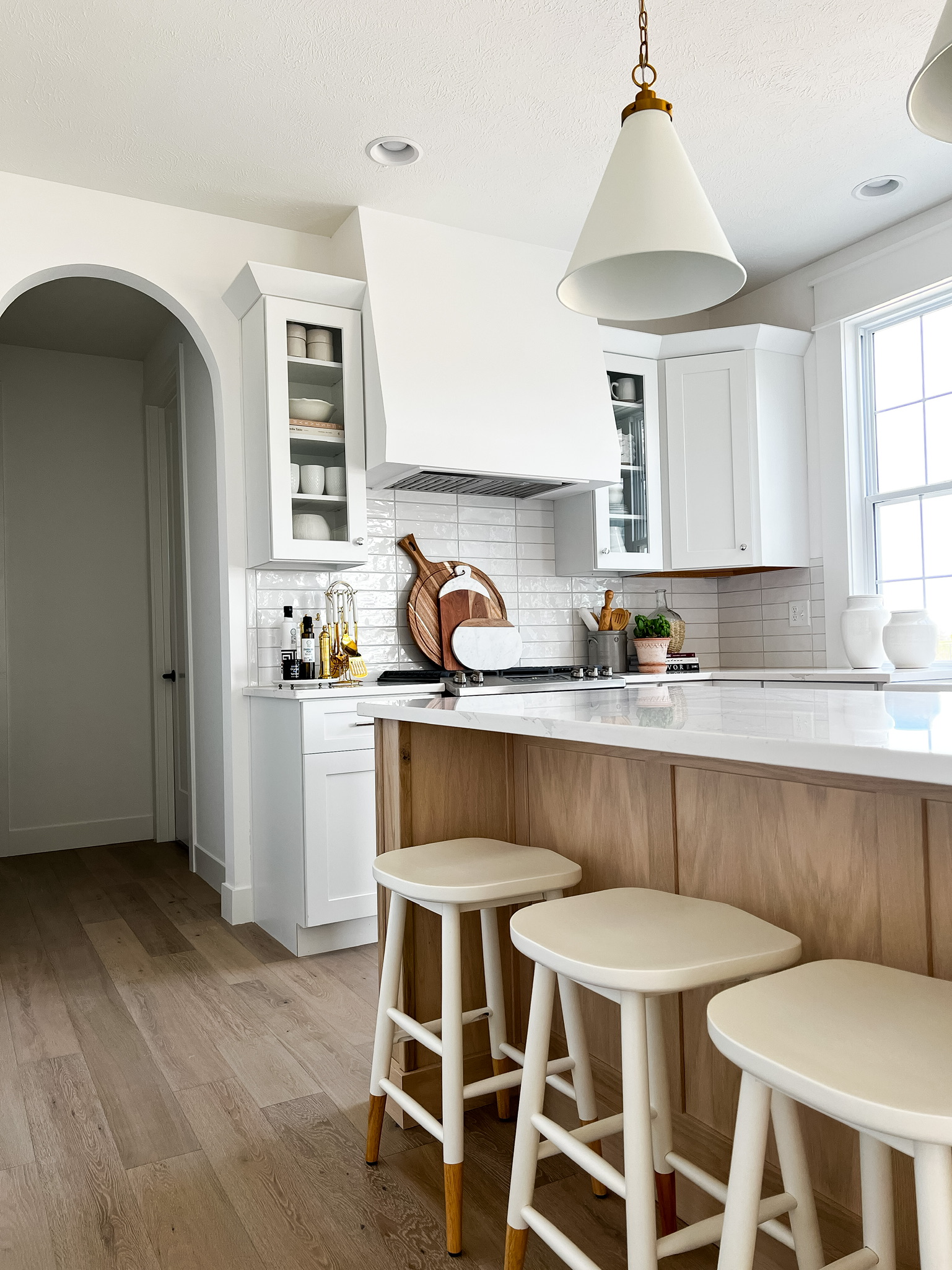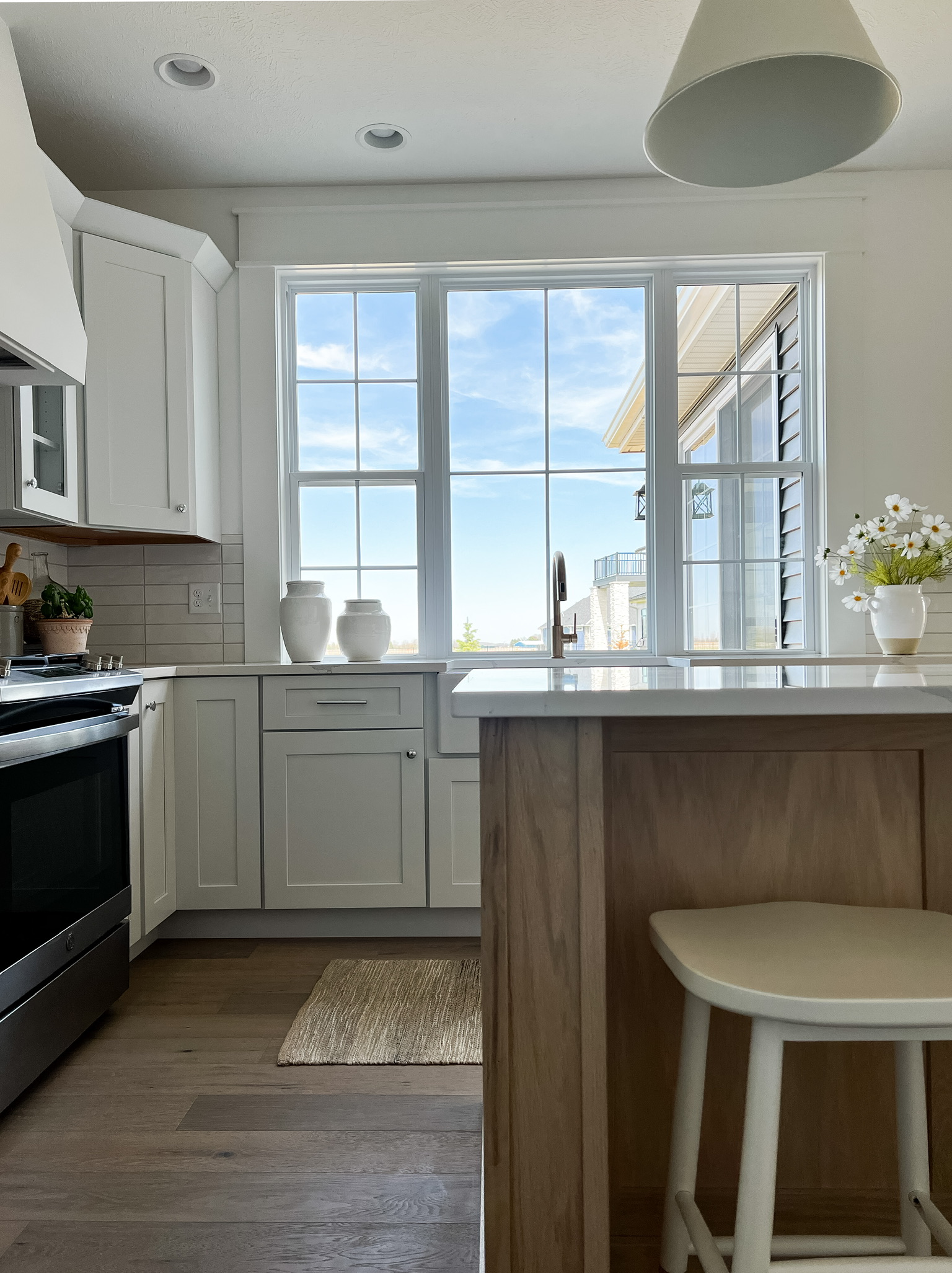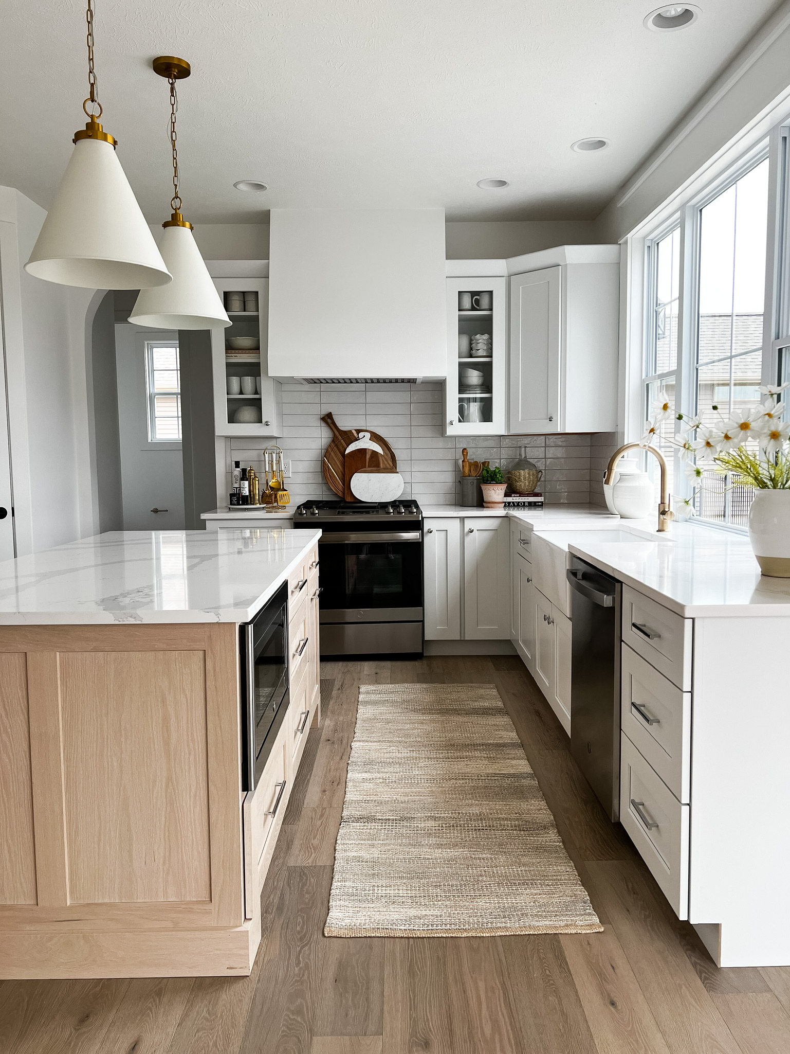 This kitchen project included custom cabinets, a plastered hood, a white oak island, and an apron sink. There are tons of characters in this pretty kitchen!