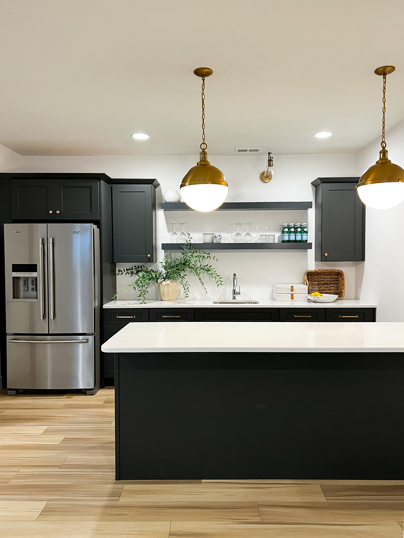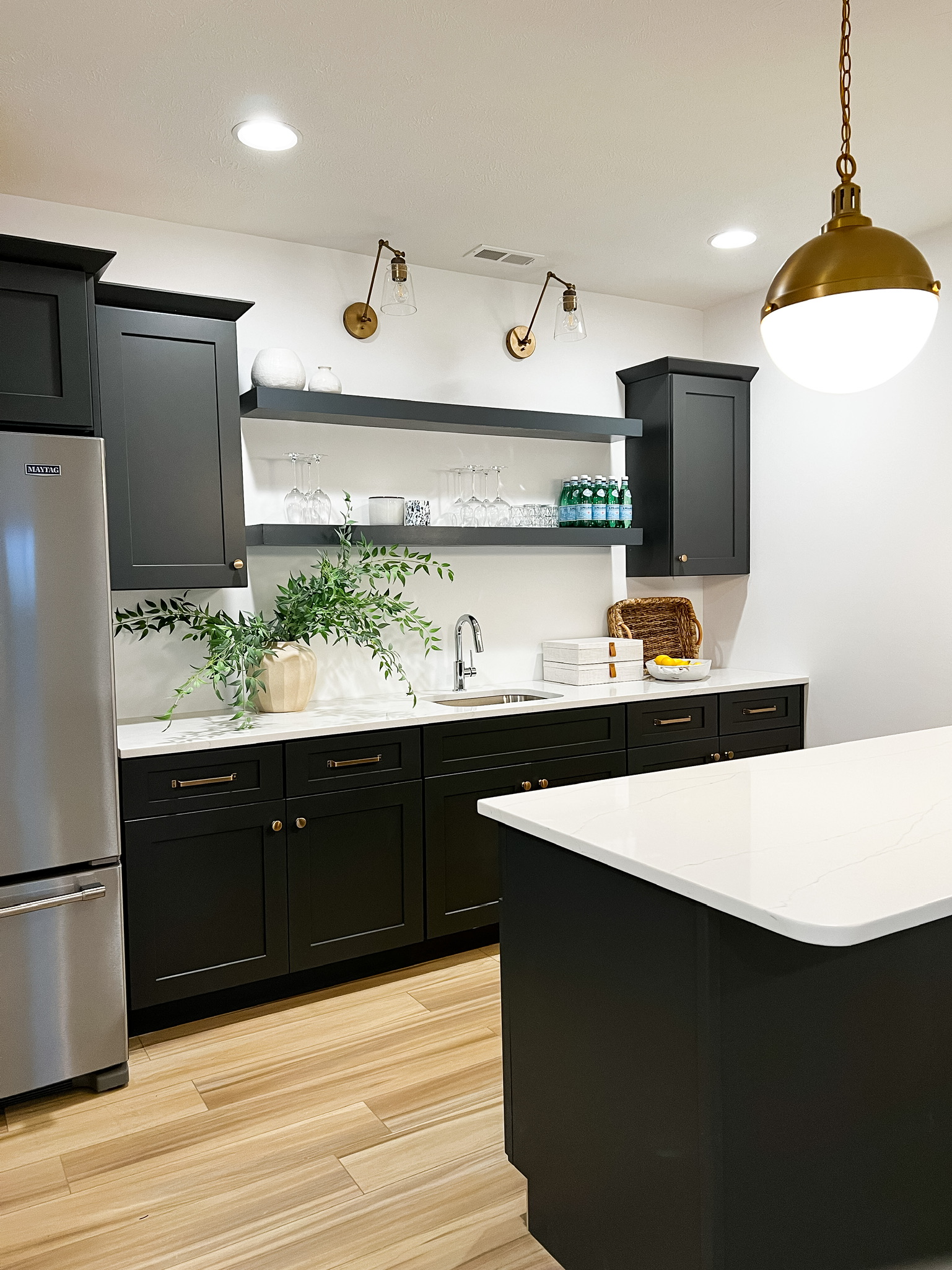 Absolutely obsessed with the way this bar project came together in this Lake Falls home’s basement. Those gold light fixtures, am I right?
