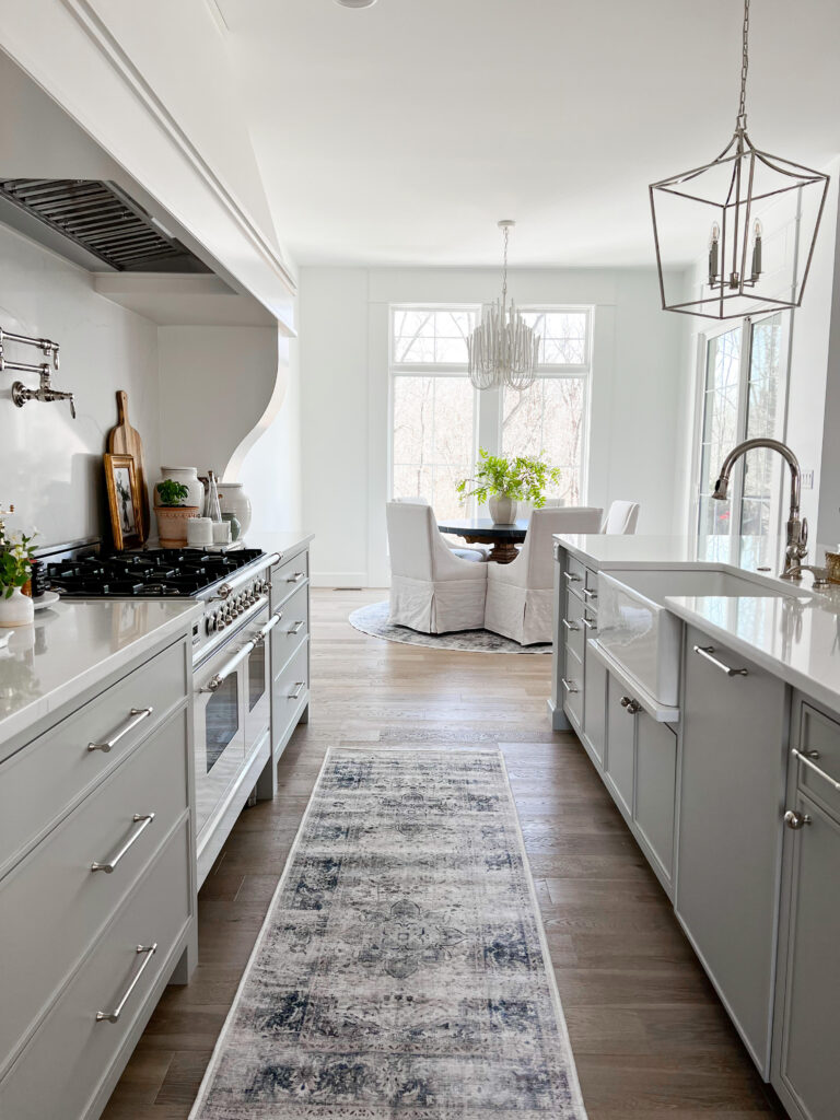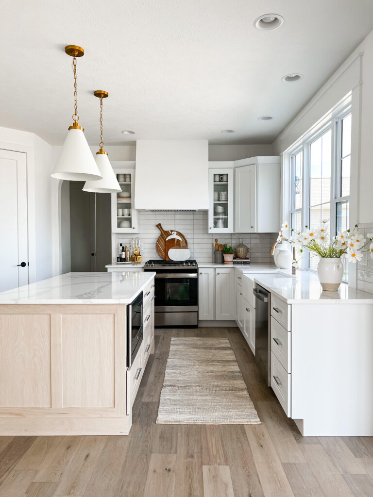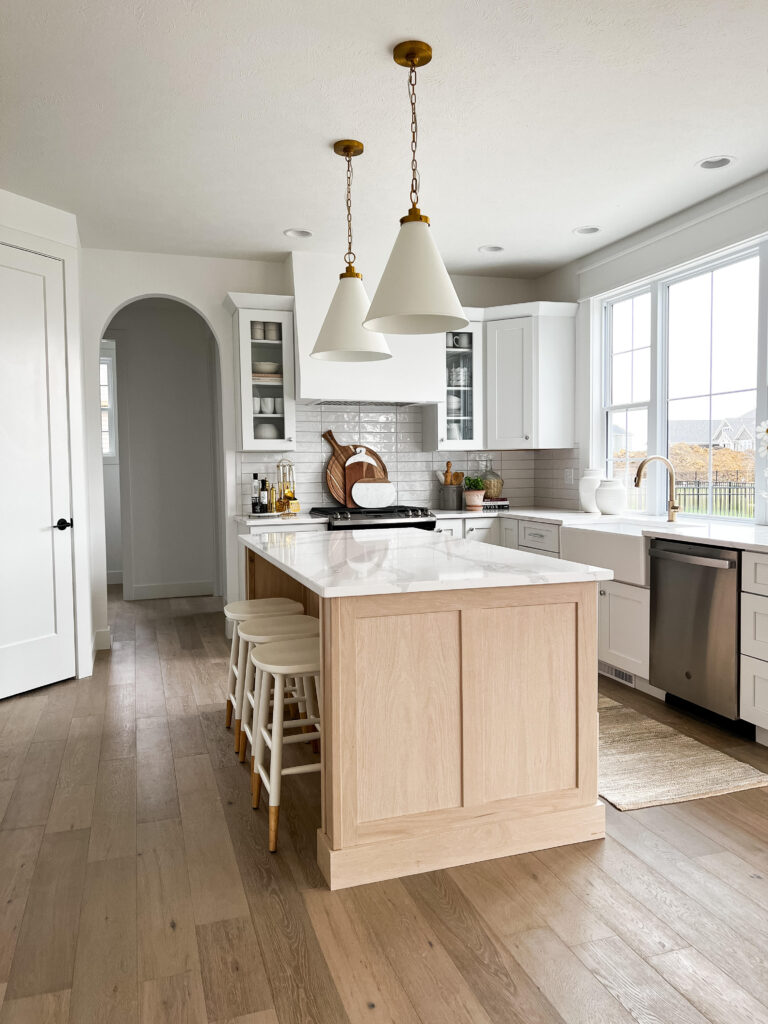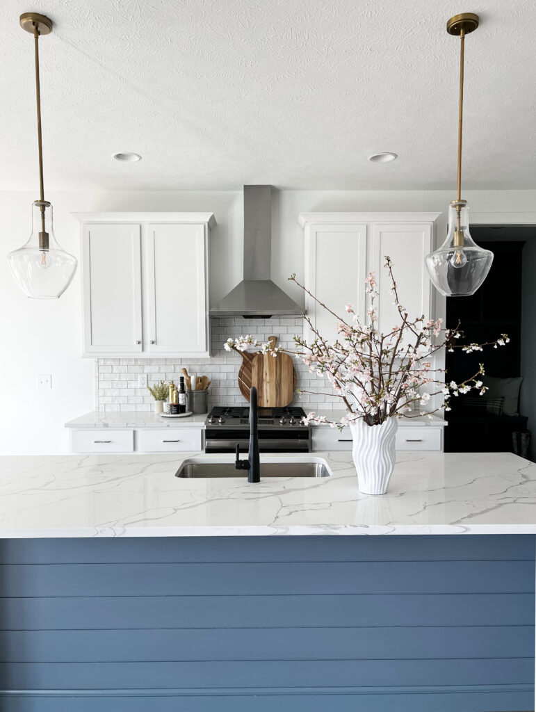 Luckily, this part can be very simple. Measure the size of your kitchen island and decide if you want two or three pendants. If you’re in love with a particular style of pendant and it happens to only come in a small size, then get three of them! There should always be even spacing between each light. Additionally, keep the outside pendants within 4-6″ inside the length of your island to ensure no one can hit their head.
